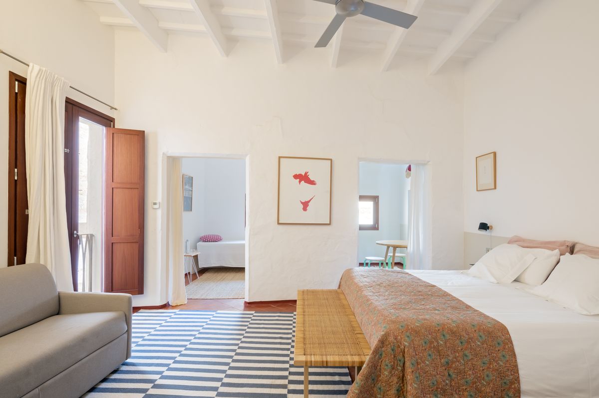 Each of the suites (11, 12 and 31) measures between 30 and 35m2 and is located in the original Ses Sucreres. All of them have a 180x200cm bed and two of them have a comfortable sofa bed 175x195cm which can be prepared for 1 person up to 17 years old on request.